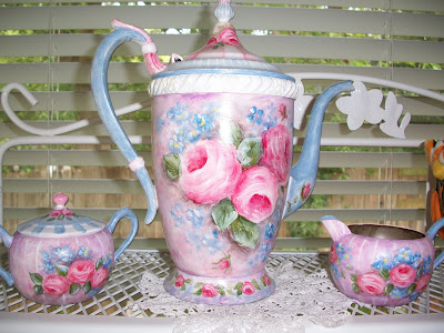 Happy Pink Saturday, dear friends. Thank you so much for stopping by. A special thank you to Beverly from "How Sweet the Sound" for graciously hosting our event each week. In my first picture, you see a favorite handpainted tea pot or coffee pot with creamer and sugar. These sit on a baker's rack in my kitchen area. The second picture is a favorite vintage looking sign that sits in a bay window area in my sunroom. The third picture is a handpainted roses china chocolate pot that I have on my mantle in my living room. The fourth picture shows some faux cupcakes displayed in my china cabinet. They look good enough to eat, don't they? The fifth picture is the sweet fairy rose that grows in my cottage garden. The sixth picture is lovely oxalis that also grows in my garden. The last picture is of a vintage angel with sweet pink cheeks. These kinds of vintage images I never tire at looking on them. I hope you have enjoyed your visit today, and I invite you to visit Beverly and all the other participants. You can find them here: http://howsweetthesound.typepad.com/my_weblog/I hope you are having a wonderful day. Sending happy wishes your way. Have a lovely weekend.
